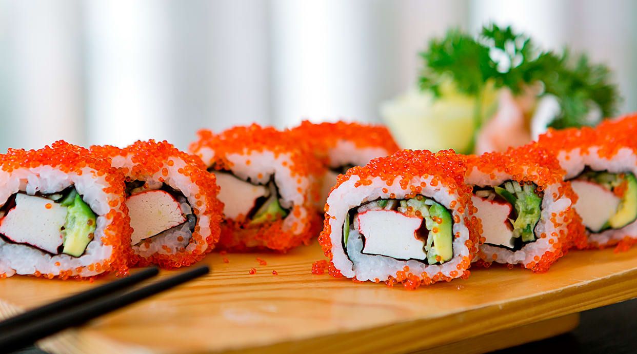 Arroz cubierto con osaka, mayonesa japonesa y sésamo, envuelto en lamina de alga.
