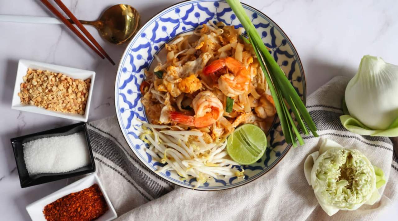 Tallarines de arroz tradicional salteado con salsa de tamarindo, brotes de soja, huevo y cacahuete