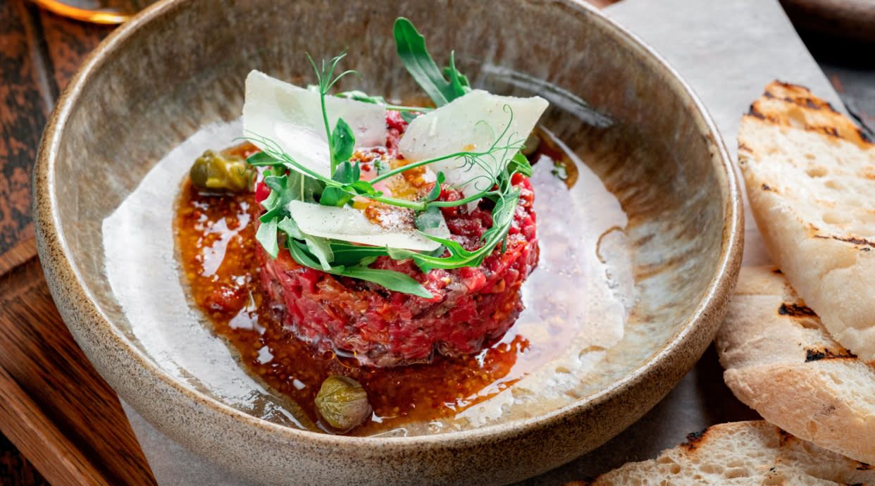 Con cebolla caramelizada, compota de mango y tostas de pan de crista