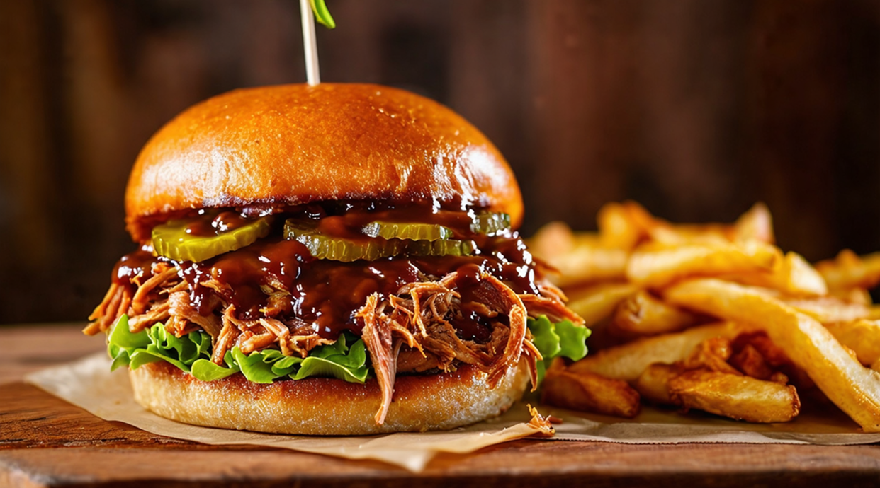 Jugosa hamburguesa con queso fundido, carne desmechada de cerdo al estilo BBQ, lechuga crujiente y tomate natural en pan brioche tostado. ¡Una combinación brutal!
