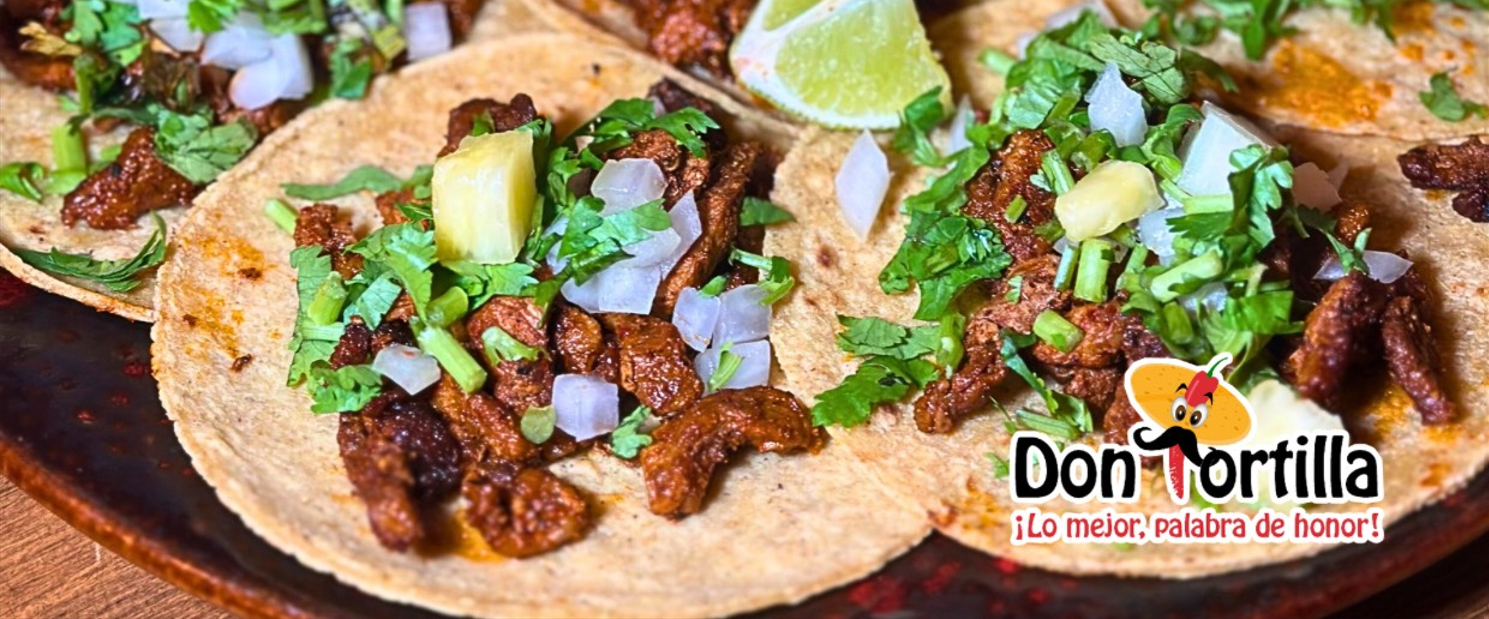 Doble tortilla de maíz recién hecha, arrachera, pastor, chorizo mexicano, frijoles refritos, cilantro y cebolla.
