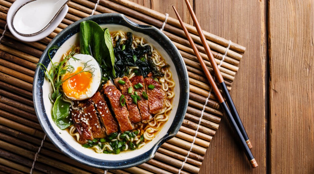 Fideos salteados al estilo wok con verdura, pato y salsa yakisoba