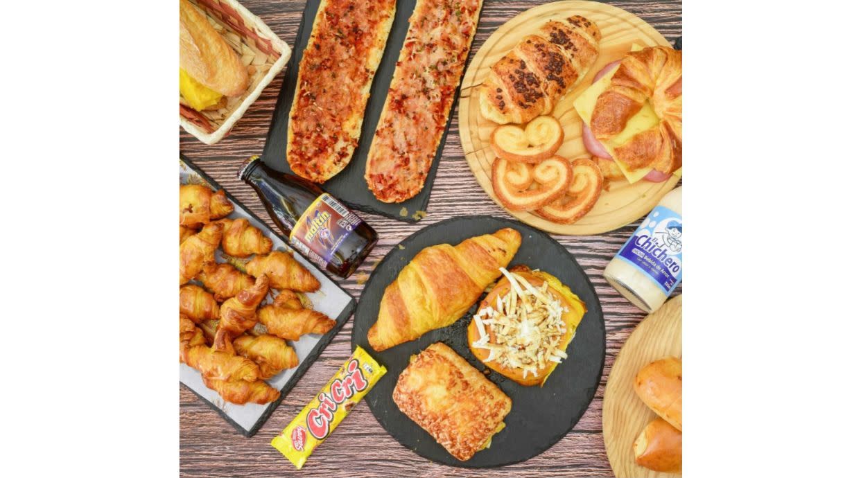Exquisita variedad de bollería y un divido pan con jamón serrano y tomate. Incluye 1 pan baguette con jamón y tomate, 4 mini croissant1 palmera de ch
