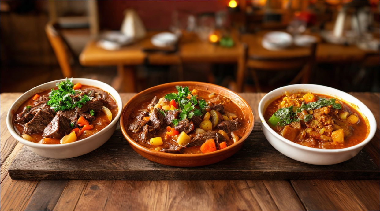 Un guiso tradicional que combina carne de res tierna cocida a fuego lento con especias y sabores únicos, a menudo acompañado de arroz y plátanos