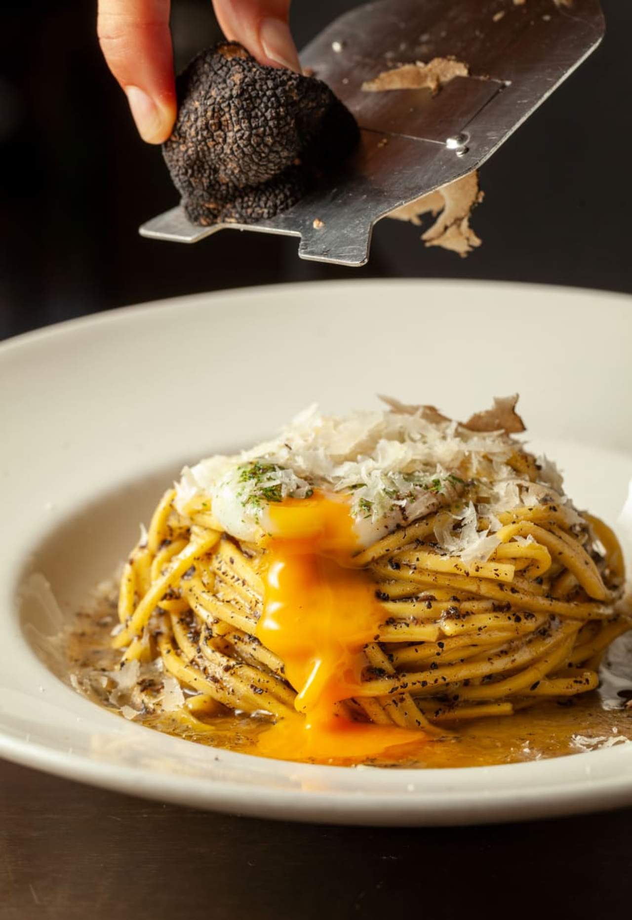 Pizza con mozzarella Fiordilatte, huevos de codorniz y trufa.