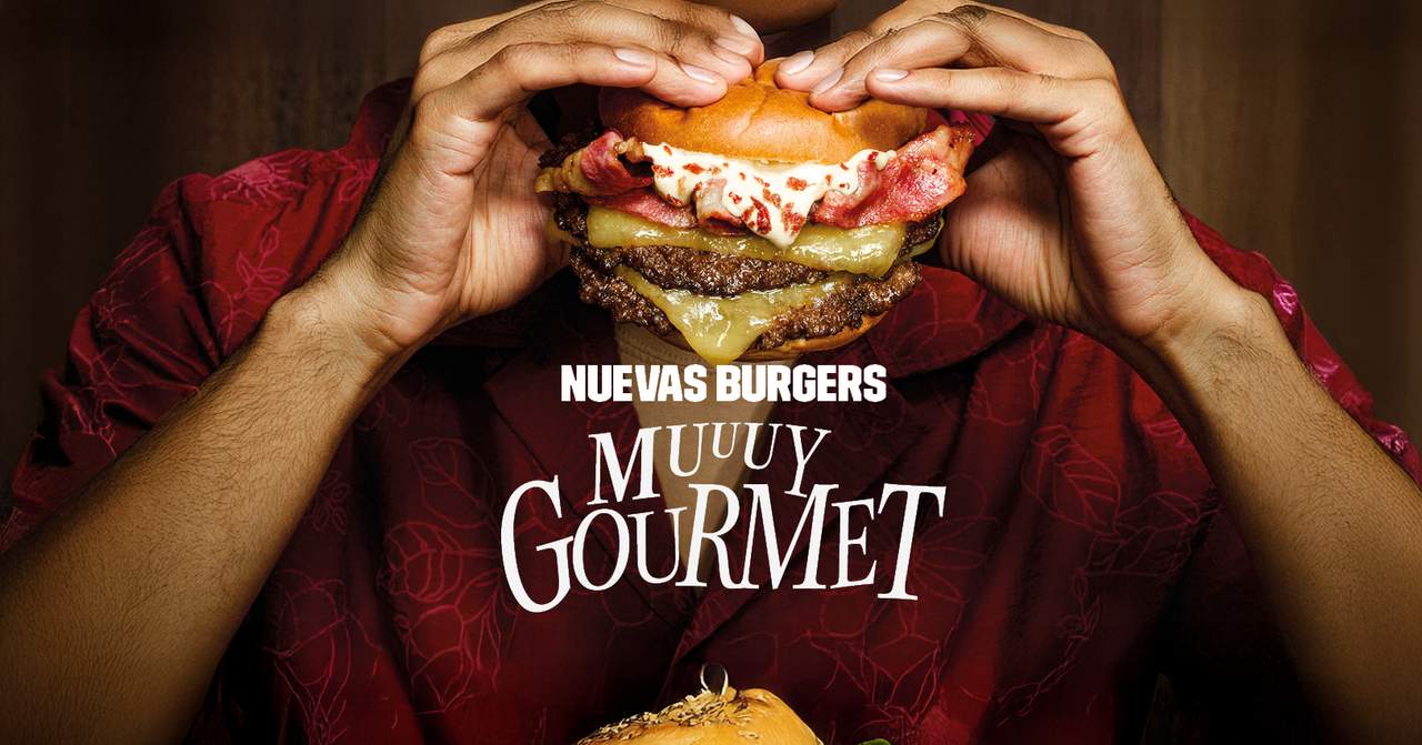 Carne con lomo de vacuno*, queso manchego, crujiente de paleta ibérica y salsa mayo-mostaza en pan estilo brioche. *60% de lomo de vacuno.