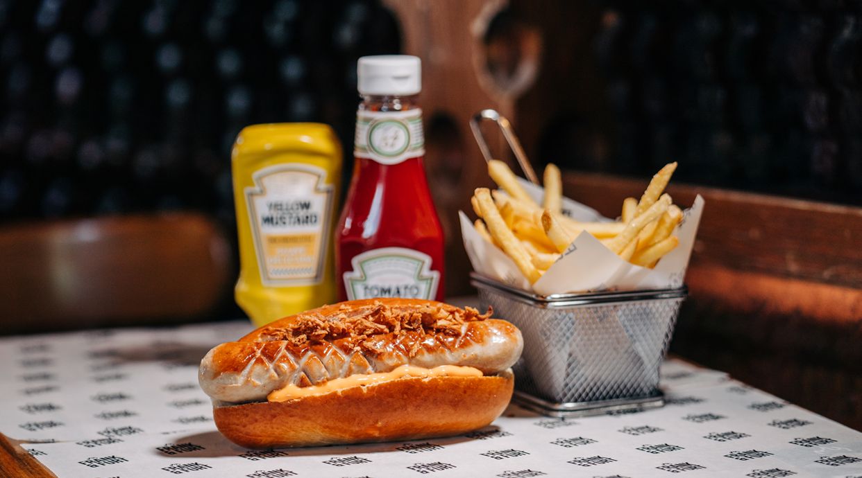 Salchicha Frankfurt y Tirolesa con choucroute, cebolla a la plancha y patatas fritas.