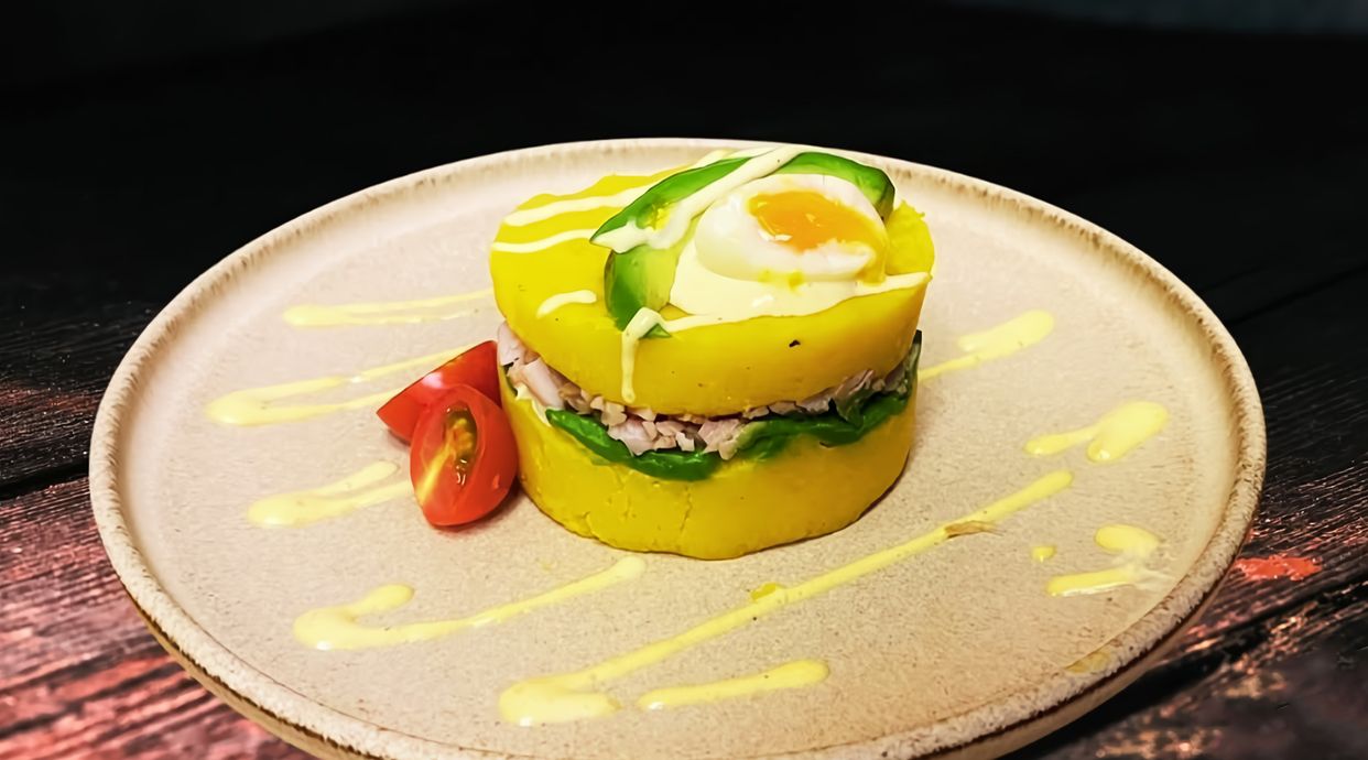 Causa limeña de papa amarilla prensada, rellena de atún con mayonesa y decorada con pescado en salsa acevichada. Decorada con palta, camote y maíz chulpe
