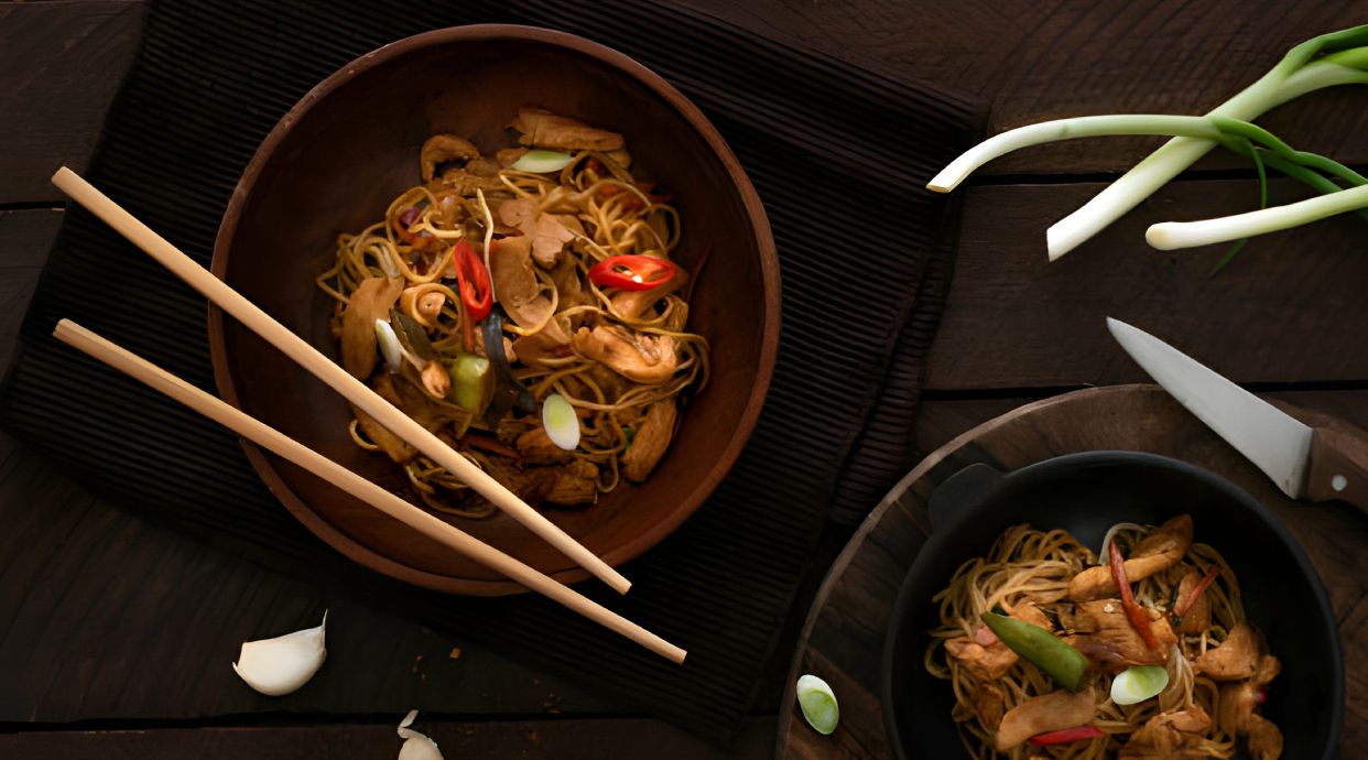 Huevo, zanahoria, repollo, cebolla, soja, pechuga de pollo frito.