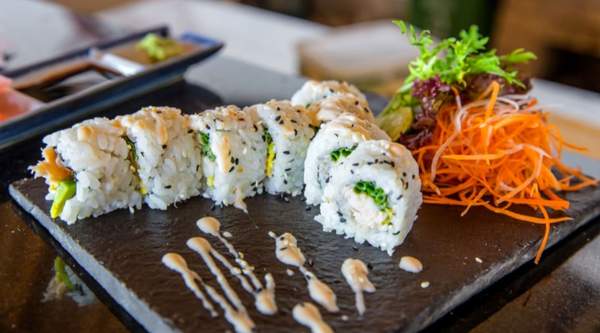 Aguacate, pepino, algas,edamame, arroz sushi , Zanahoria , Maiz y salsa mayonesa picante y ponzu/ Avocado, cucumber, seaweeds,edamame, sushi rice , Carrots, sweet corn spicy mayo sauce and ponzu sauce.