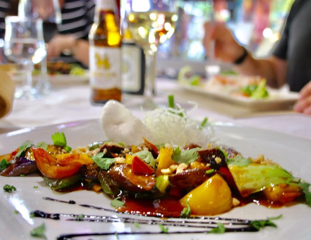 Tiras de pechuga de pato, combinadas con lechuga, apio, pepino, tomate cherry, pimiento rojo, cilantro y hierbabuena, aliñada con chili dulce