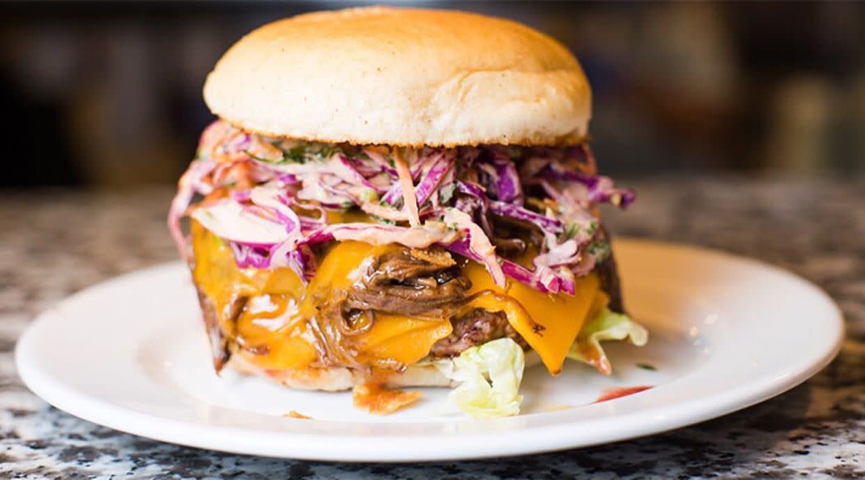 Hojas verdes, queso cheddar, pulled pork cocinado con salsa bbq al bourbon y culminado con chilli fresco loncheado