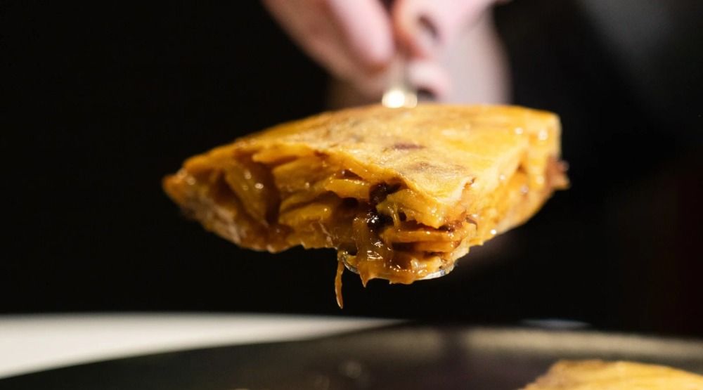 Huevos camperos y de primera puesta, patata asturiana, cebolla confitada y aceite de oliva virgen extra. Sabor auténtico, sin añadir nada más.