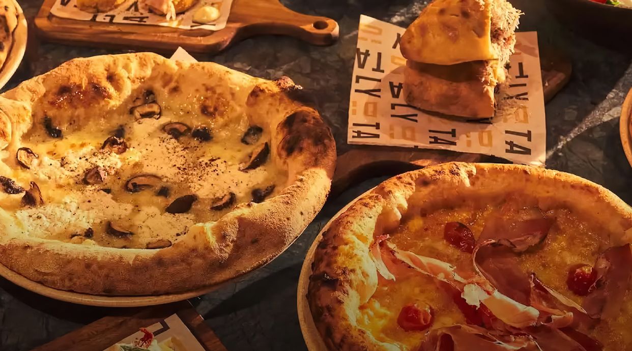 Mozzarella Fior Di Latte, champiñón portobello, queso de cabra, crema tartufatta, Grana Padano D.O.P., miel y pimienta negra.