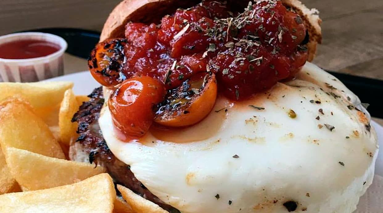 Carne smash, cheddar, bacon, tomate, huevo, cebolla confitada, salsa irish, acompañada de patatas