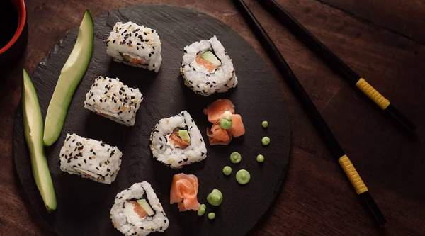 Salmón, aguacate y queso crema cubierto de sésamo.
