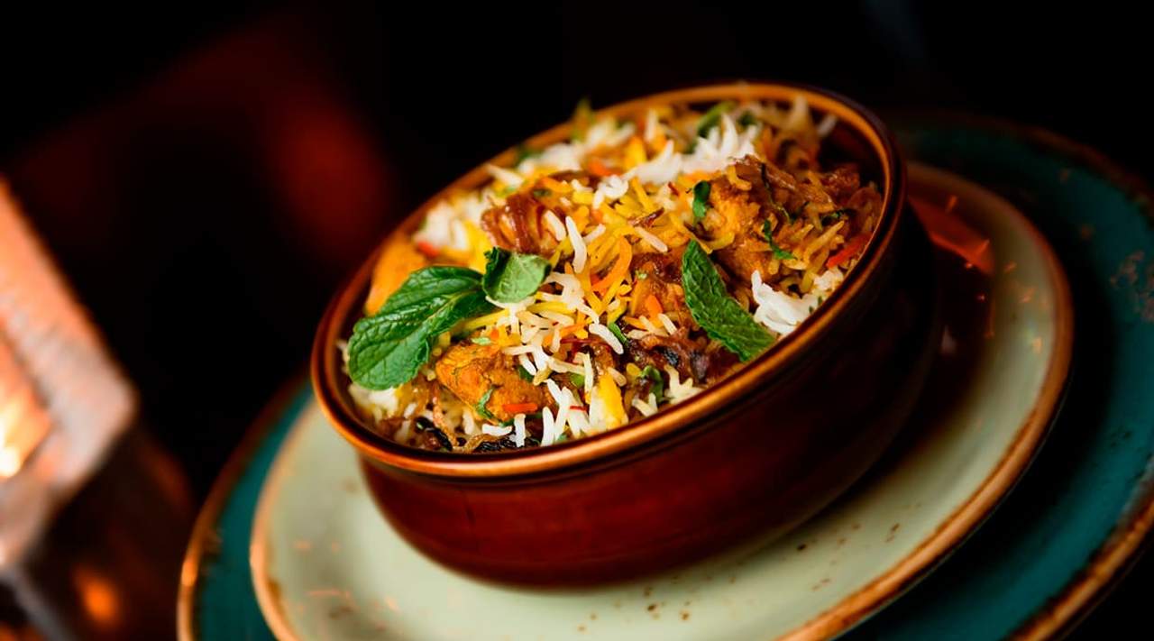 Arroz cocinado con pollo, cordero, gambas, anacardos, almendras, pasas sultanas y pistachos, servido con salsa vegetal