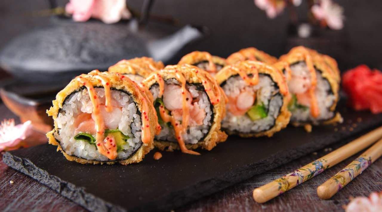 Salmón, aguacate, tempura pollo, cangrejo, salsa agripicante