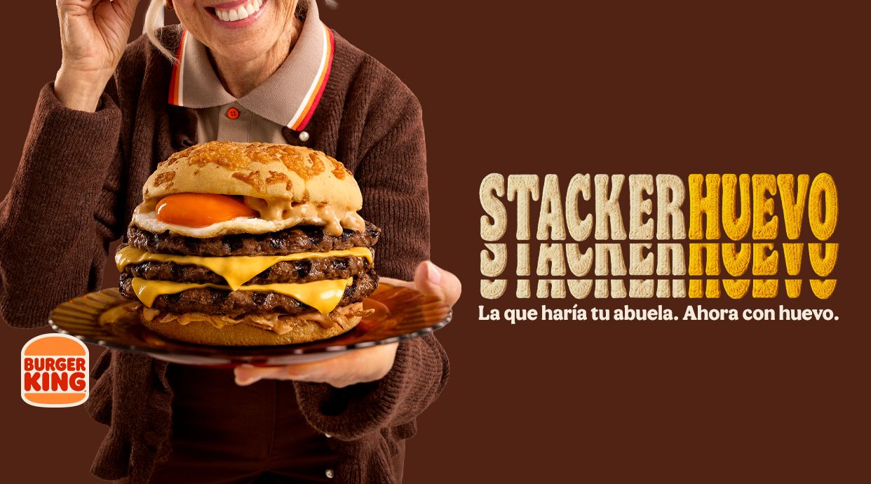Aquí tienes la burger que te pondría tu abuela: doble carne Whopper® a la parrilla, lonchas de cheddar fundido, pan brioche con cheddar, nuestra irresistible salsa Stacker y un toque crujiente de cebolla frita. Acompáñala con tus patatas y bebida favorita.