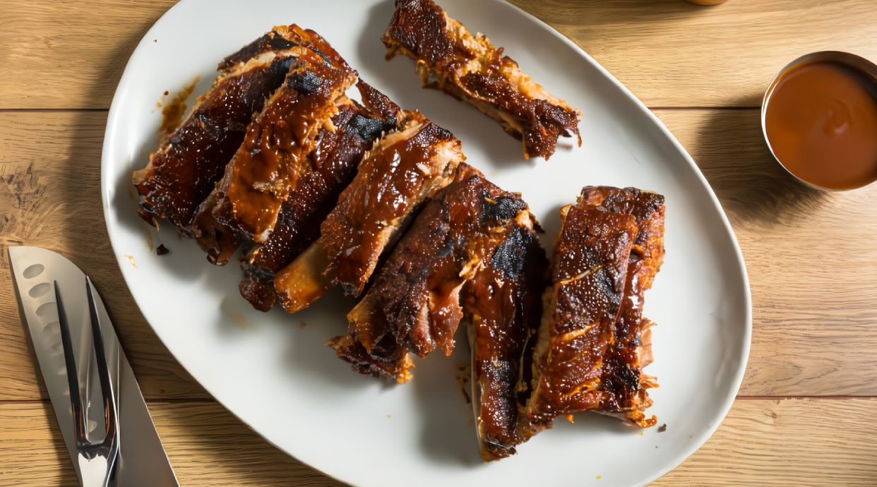 Costillas de cerdo cocinadas con salsa barbacoa. Con patatas