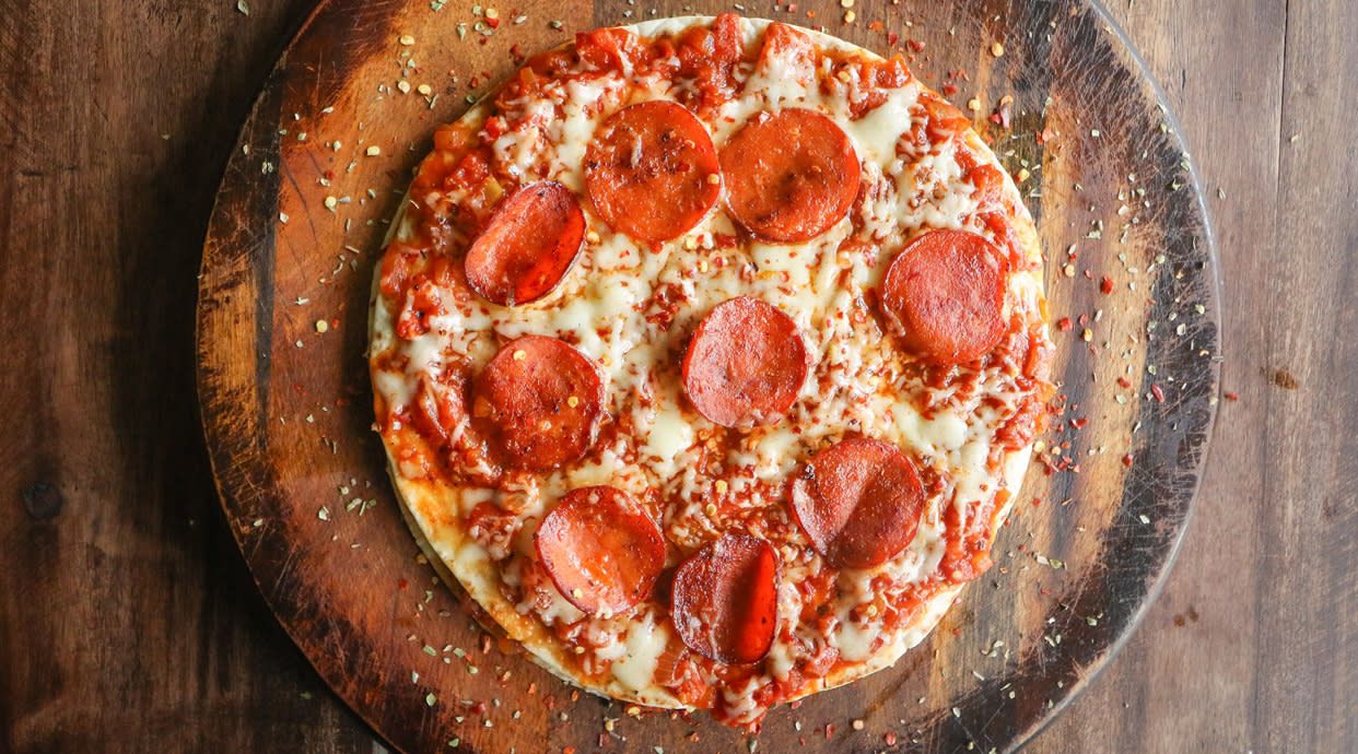 Salsa de tomate, mozzarella italiana, bacon y salchichas