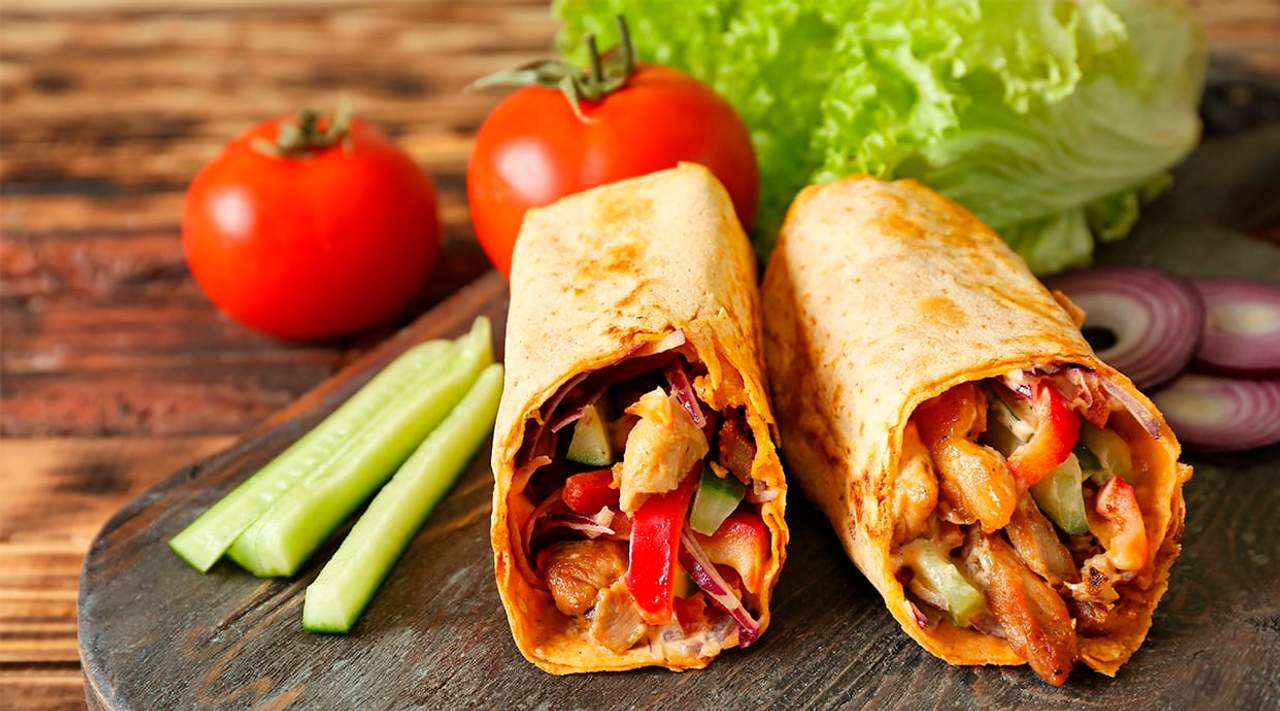 Carne de pollo, lechuga, tomate, cebolla, salsa picante, salsa dulce, queso oveja
