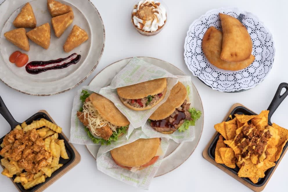 2 arepas a elegir, 1 ración de papas mexicanas + 1 salsa de aguacate + 2 refrescos a elegir