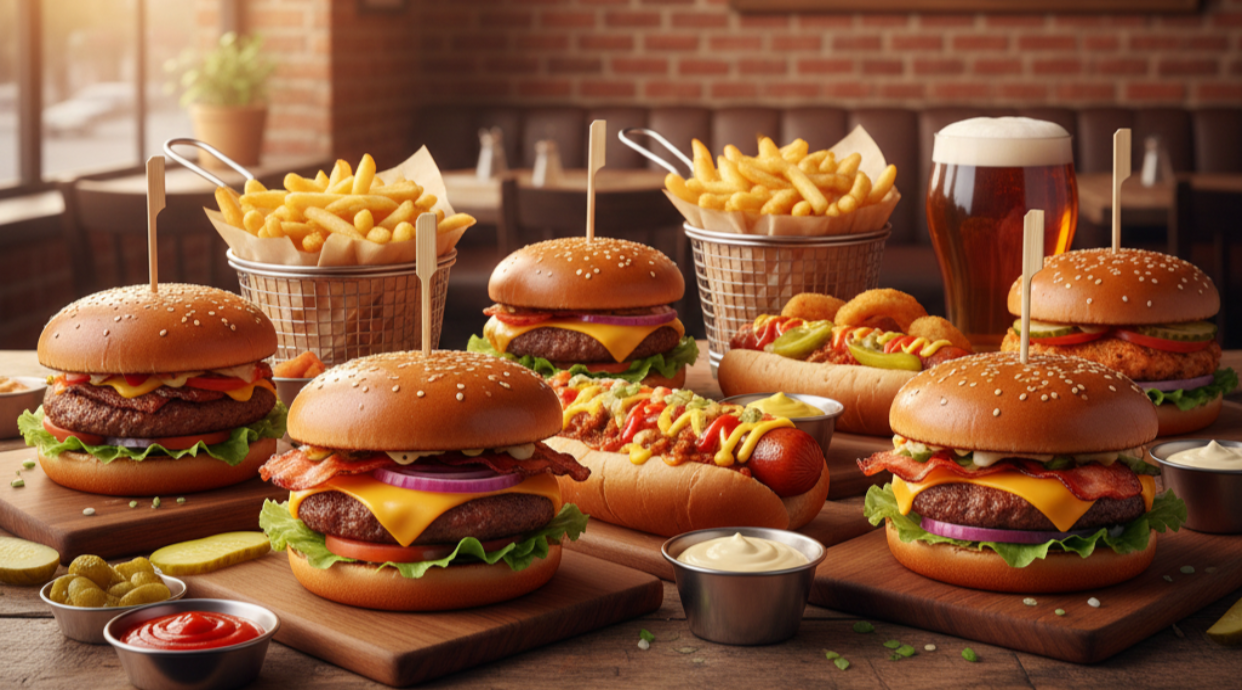 Carne angus (180 g.), queso cheddar, lechuga fresca, tomate, cebolla caramelizada y salsa secreta. Incluye patatas
