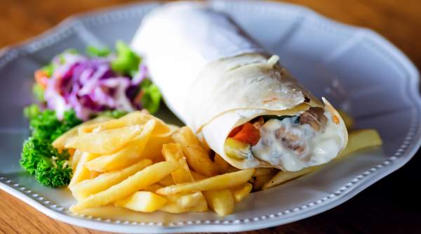 Lechuga, tomate, cebolla, queso de oveja o falafel (ración), patatas fritas o arroz, salsa blanca y salsa picante
