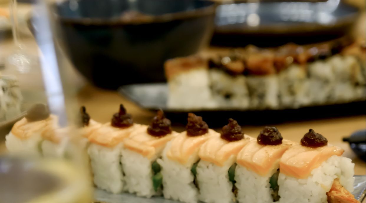 Llagostí cruixent, formatge crema i alvocat. Cobert de salmó flamejat i ceba caramelitzada