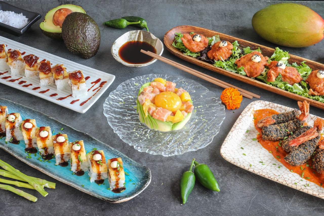 Langostinos crujientes, tobiko, kimchie y aliolí de mango