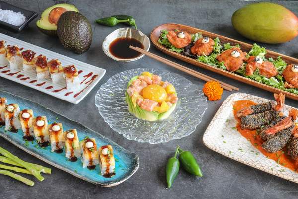 Futomaki de salmón, aguacate piña caramelizada e ikura.