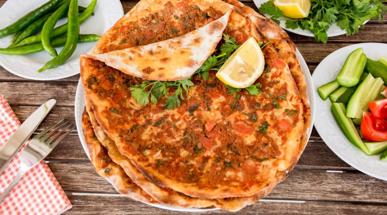 Lahmacun, carne de ternera, pollo o mixto, lechuga, tomate, cebolla y salsa