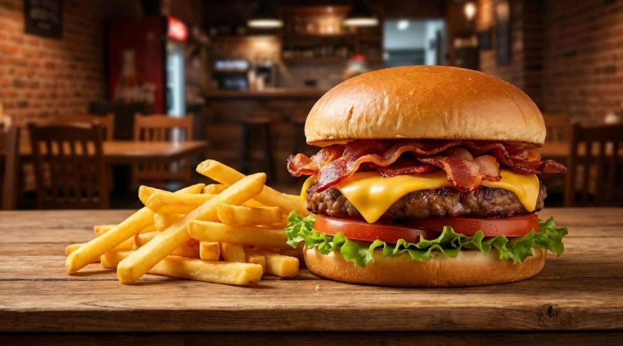 Lechuga, tomate, cebolla, bacon, huevo, carne, queso cheddar, cebolla caramelizada, papas y salsas (kétchup, mayonesa y mostaza).