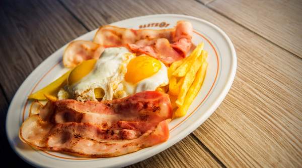 Filete ternera, ensaladilla, tomate, fresco, 2 huevos fritos a la plancha, jamón cocido extra, patatas y pan