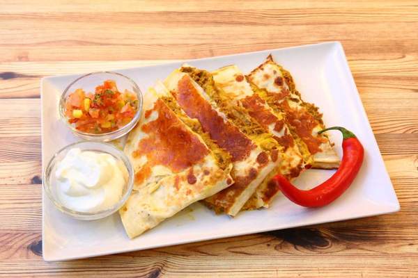 Tortilla de trigo con queso fundido mozzarella, ternera mechada, pico de gallo y guacamole