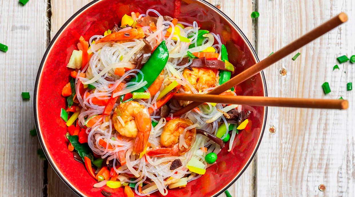 Fideos yakisoba salteados con huevo, verduras y langostino rebozado