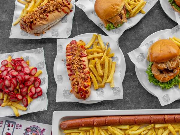 Pan de bombón, salchicha danesa (pollo y cerdo), salsa de queso cheddar, kétchup, mostaza, mayonesa, cebolla frita, patatas fritas y bebida a elegir
