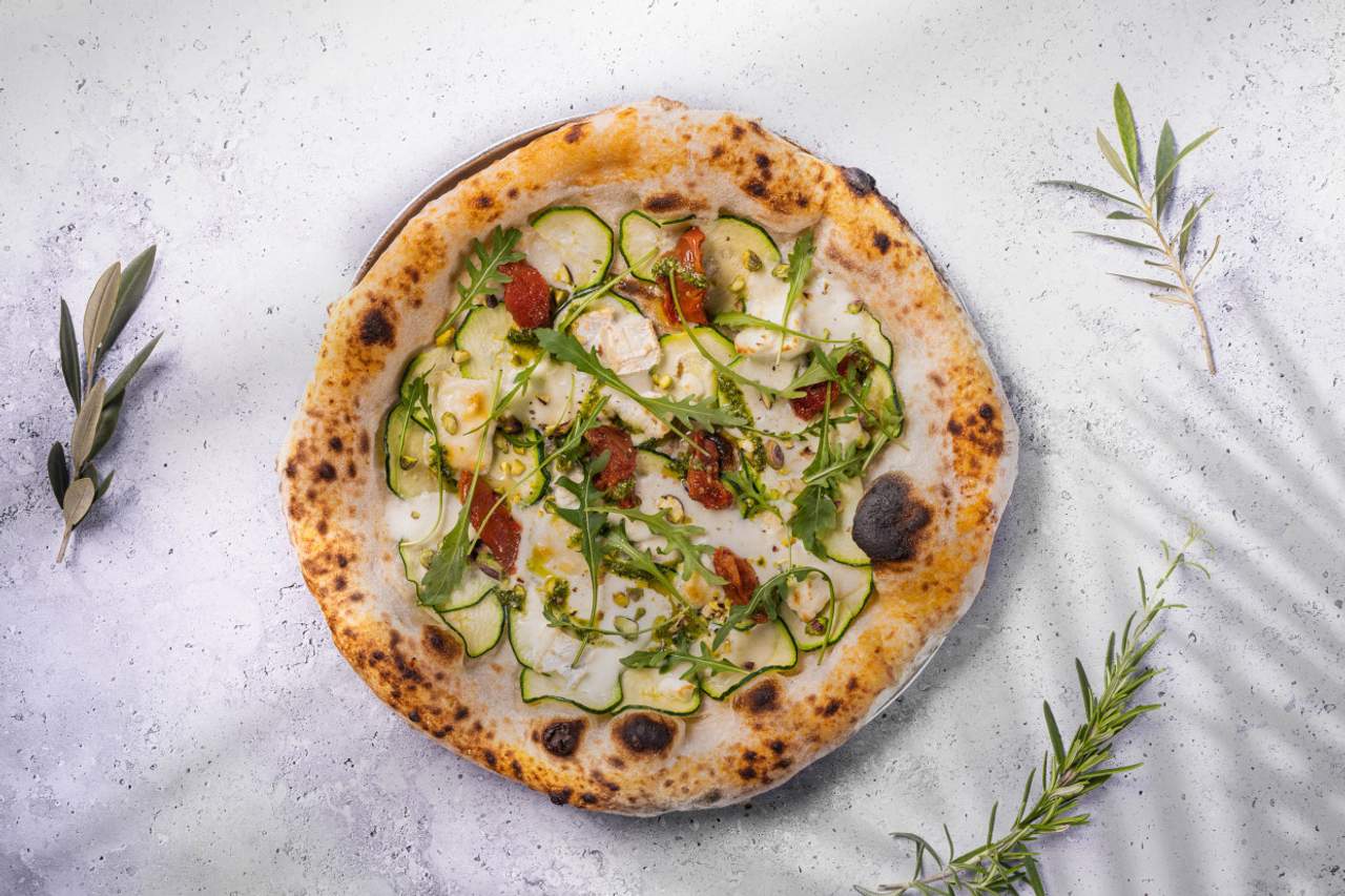 Calabacines, mozzarella fior di latte, queso de cabra, tomate semiseco, pistachos, pesto y albahaca