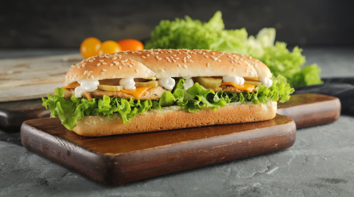 Crujiente doble pollo con salsa especial de la casa, con doble queso cheedar fundido, bacon con su pan brioche