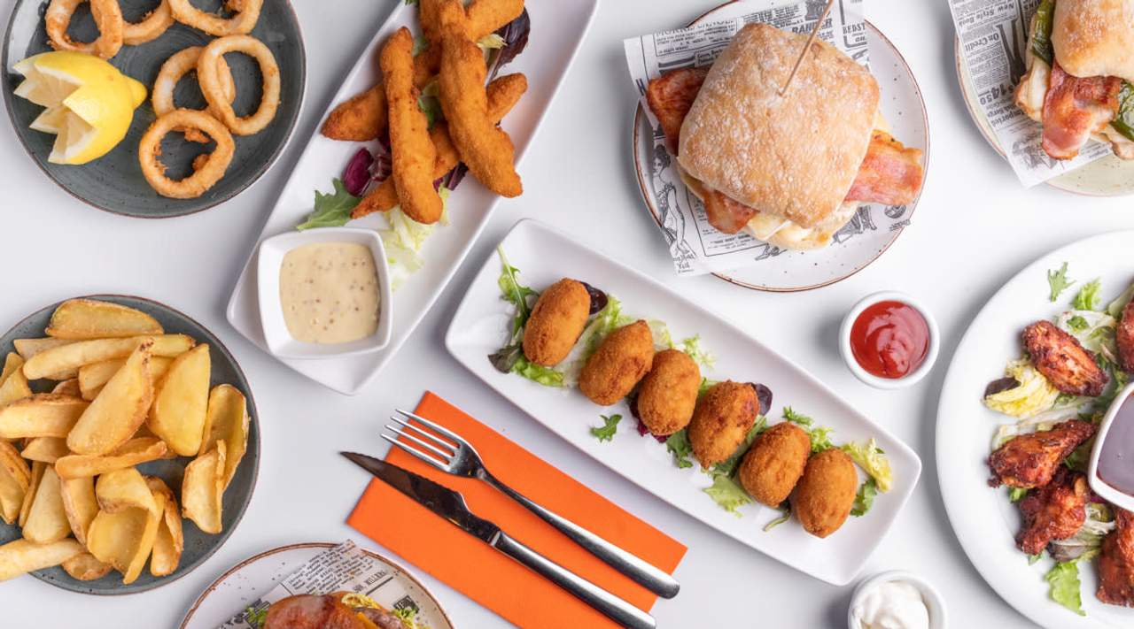 Fingers de solomillo de pollo empanado, mayonesa casera, mezclum, cebolla caramelizada, bacon y patatas fritas