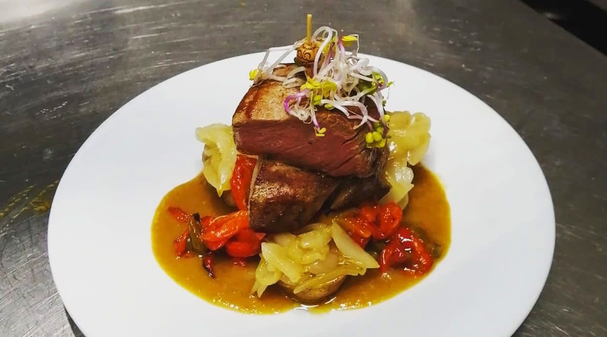 Filete de ternera, pimientos y cebolla fritos, mahonesa