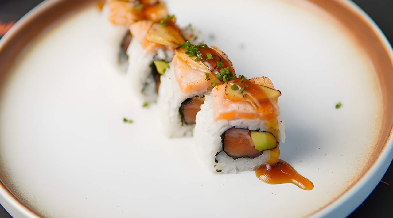 Salmón, aguacate, mayonesa wasabi, teriyaki y almendra