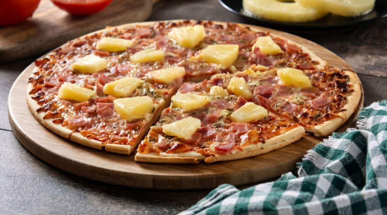 Tomate, mozzarella, carne picada, cebolla, bacon y piña con borde relleno de mozzarella