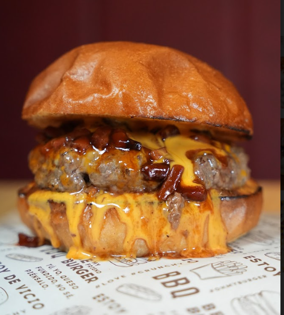 Patty (180 g.) de buey madurado, queso cheddar, doble bacon crunchy y pan brioche de patata