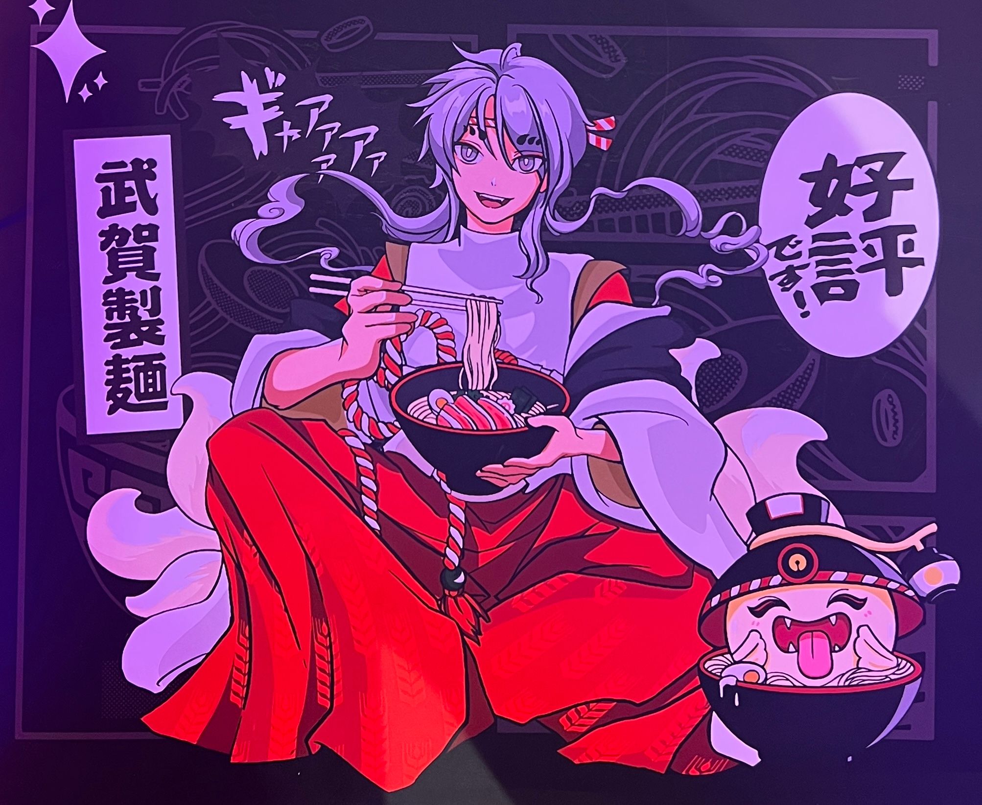 Fideos, langostino frito con salsa okonomiyaki, bambú, pak choi, cebollino, cebolla frita, nori, huevo, brotes de soja, col china, salsa picante y tiras de puerro