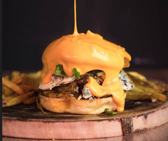 Doble carne de ternera, cebolla tomate, lechuga, 5 quesos (cabra, azul, parmesano, cheedar y mozzarella) y salsa mr fry