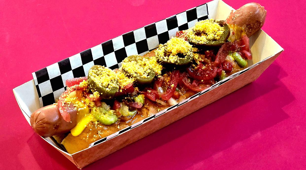 Brioche, salchicha, guacamole, pico de gallo, cebolla encurtida, salsa cheddar y jalapeño