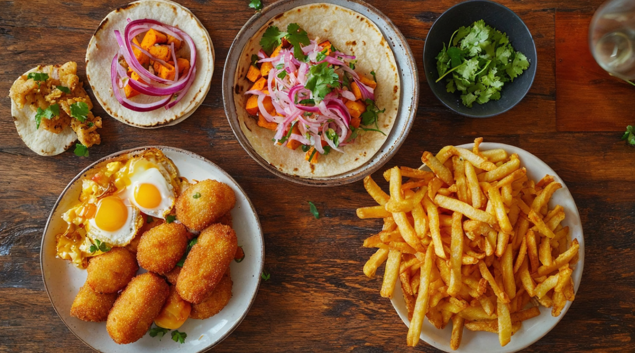 Alitas de pollo, salchichas artesanales con crocantes papas fritas, tostones de plátano, salsa de rocoto y ají amarillo