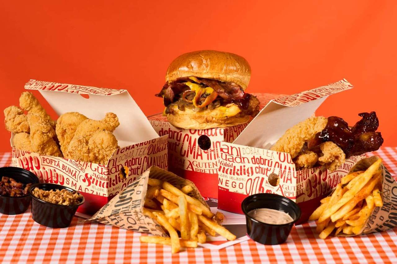 9 Tiras de pollo frito estilo Lousiana con la salsa y el topping que más te guste, dos raciones de patatas fritas y dos bebidas a elegir